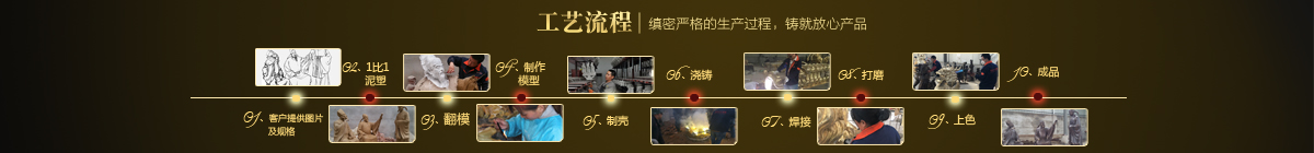 制作一件完美的鑄銅雕塑,最重要的步驟就是制作泥塑模型,然后再用工業(yè)硅膠拓印、翻模。所以泥塑的姿態(tài)、神情生動(dòng)與否直接影響最終銅雕塑的品質(zhì)。所以我廠一直對(duì)泥塑模型的制作格外重視。我廠以雕塑為本,以藝術(shù)為根,挾中華文化之傳統(tǒng),偕歐陸藝術(shù)之風(fēng)韻,風(fēng)格獨(dú)特,盡顯淋漓盡致。我們本著大膽創(chuàng)新、勇于突破的精神,以追求卓越為導(dǎo)向,堅(jiān)持寧缺勿濫為原則,并可依照您提供的要求,為您量身設(shè)計(jì)制作。我廠人才濟(jì)濟(jì),有智慧嚴(yán)謹(jǐn)?shù)墓芾戆嘧?,眾多年輕充滿激情、充滿創(chuàng)意的專業(yè)設(shè)計(jì)團(tuán)隊(duì)、有專業(yè)技術(shù)精湛的雕塑制作人才和專業(yè)的施工隊(duì)伍。他們不僅具深厚的文化藝術(shù)底蘊(yùn),更汲取當(dāng)代雕塑精華,博采眾家之長(zhǎng),作品既有嚴(yán)肅莊重寫實(shí)題材,也有輕松前衛(wèi)的抽象題材,表現(xiàn)手法上浪漫主義中不乏樸實(shí),現(xiàn)實(shí)主義中蘊(yùn)涵著激情,設(shè)計(jì)理念貫穿古今、融匯中西,深刻詮釋著藝術(shù)的精髓,把古典主義和后現(xiàn)代主義完美的融合,將雕塑藝術(shù)演繹為力的凝聚、美的體現(xiàn),讓人們感受到的不僅是一種藝術(shù)的浪漫與優(yōu)雅、粗獷與悲壯、更是豐富的優(yōu)秀藝術(shù)寶藏和文化傳統(tǒng),讓您在藝術(shù)與文化中穿流,在時(shí)空中飄蕩,使靈魂在藝術(shù)的海洋洗禮。 MORE+
